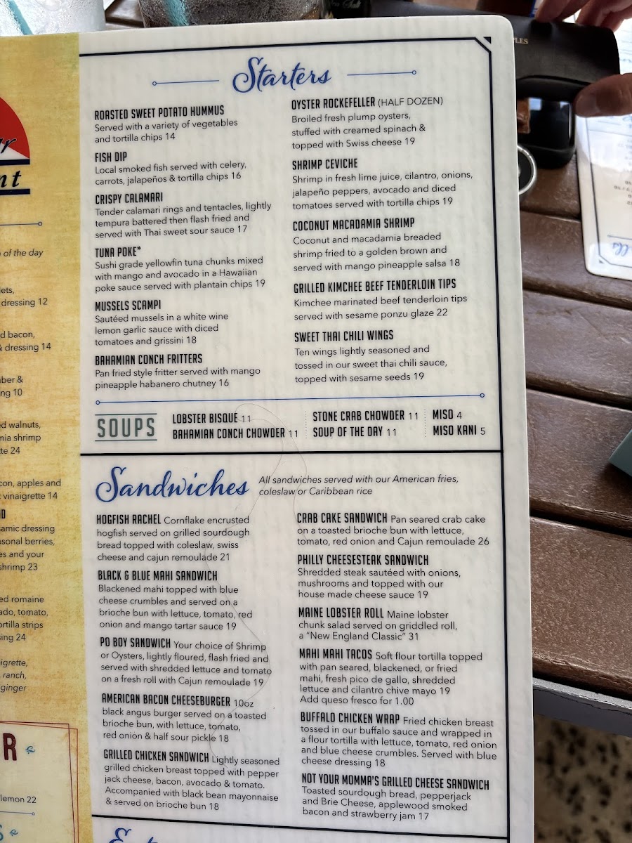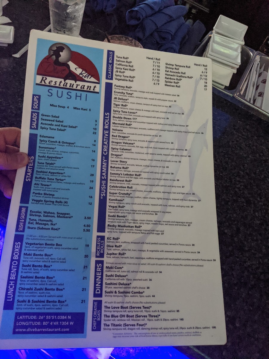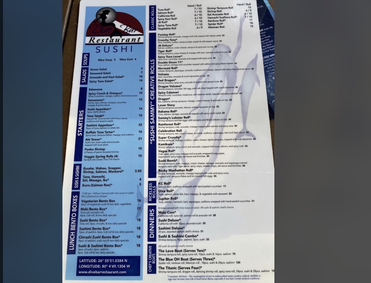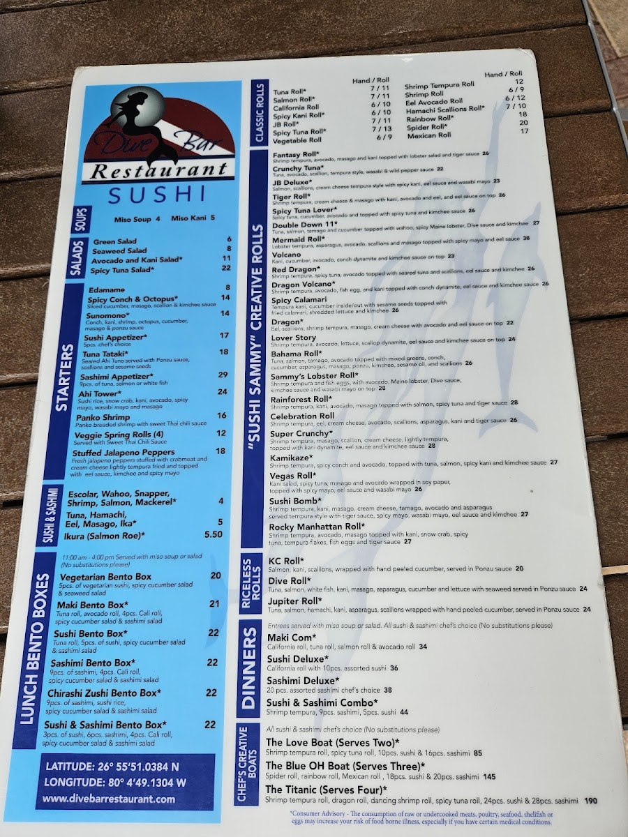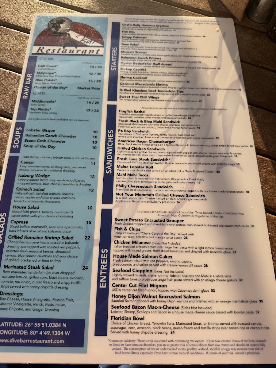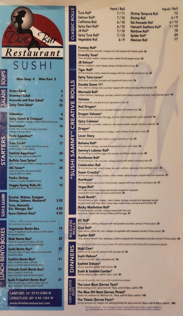Dive Bar Restaurant specializes in fresh seafood and sushi, offering a menu that tantalizes the taste buds with innovative creations and classic favorites. Begin your culinary journey with the Lobster Bisque for a rich, creamy delight that dances on your palate at just $10. Or opt for the Bahamian Conch Chowder ($9)—a savory tribute to the flavors of the Bahamas, perfect for warming up those Florida evenings. And don’t miss the Stone Crab Chowder, a local delicacy that encapsulates the essence of Florida's bounty.